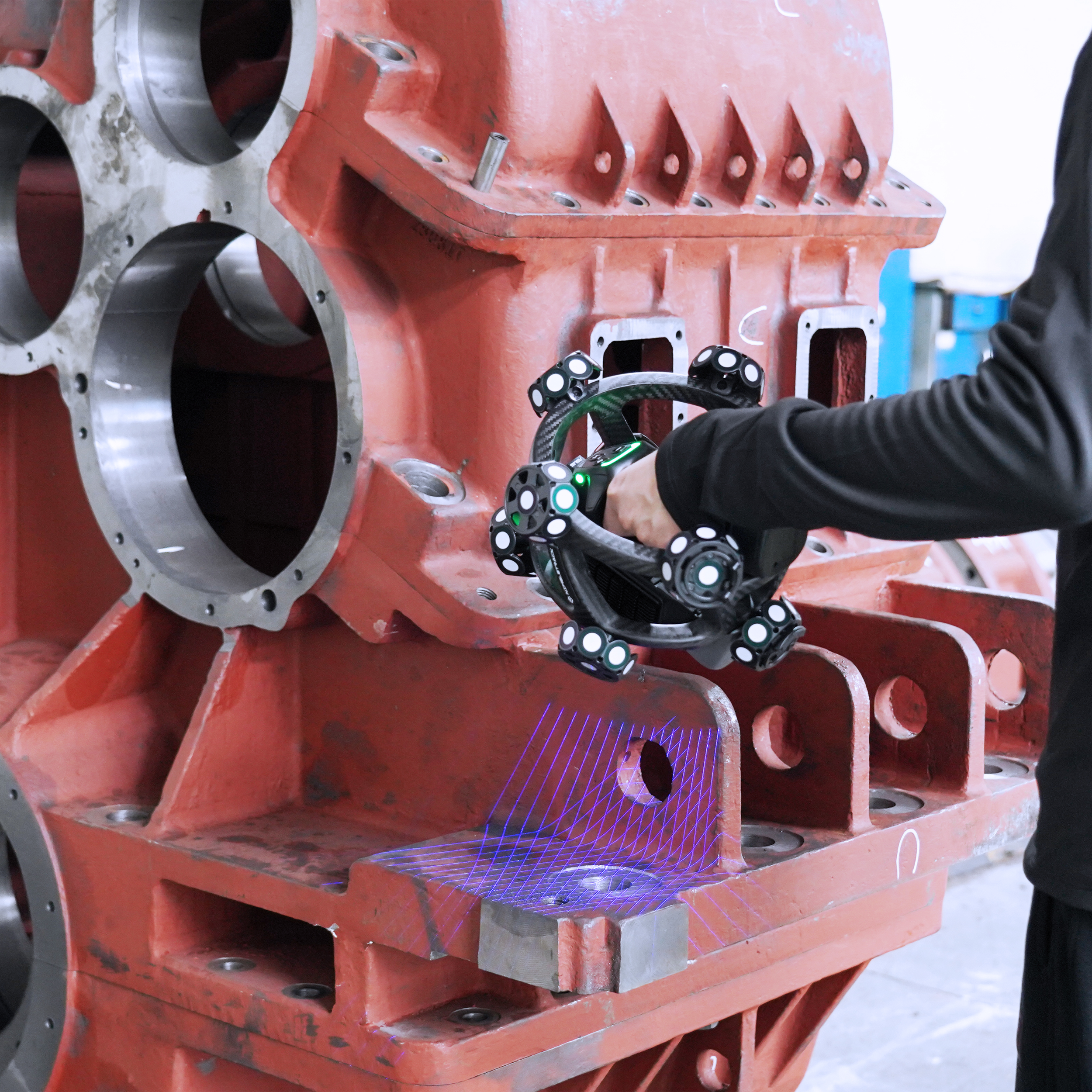 Los escáneres 3D de seguimiento de Scantech® combinan sistemas de tracking óptico con escaneo láser de alta precisión para capturar datos 3D de piezas grandes sin necesidad de marcadores, optimizando significativamente los tiempos de medición.